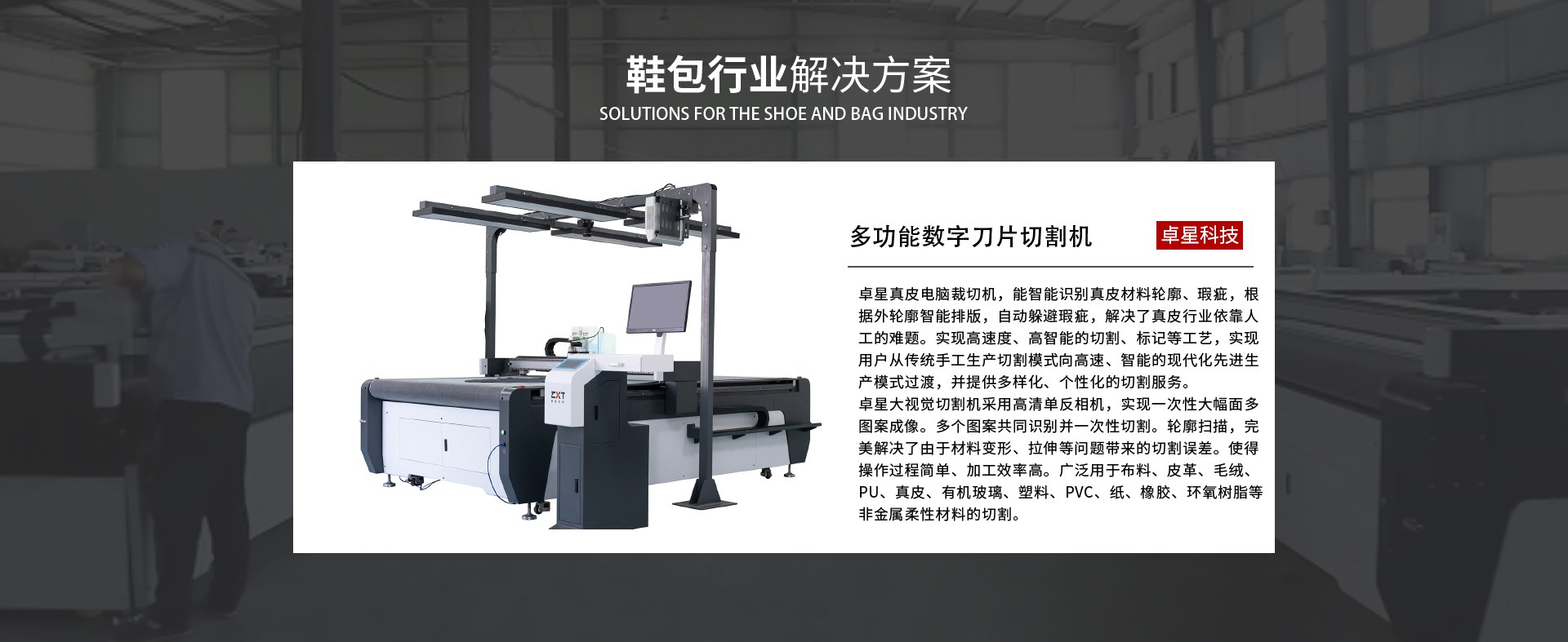卓星真皮電腦裁切機,能智能識別真皮材料輪廓、瑕疵,根據外輪廓智能排版,自動躲避瑕疵,解決了真皮行業(yè)依靠人工的難題。實現高速度、高智能的切割、標記等工藝,實現用戶從傳統手工生產切割模式向高速、智能的現代化先進生產模式過渡,并提供多樣化、個性化的切割服務。